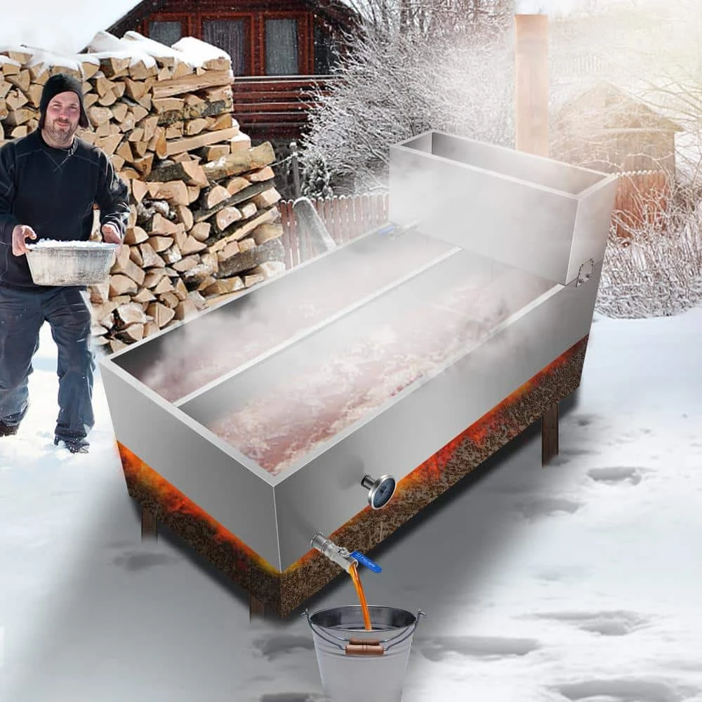 - Considerate Design: The addition of a feed tank and a divider board plays an important role. The feed tank can preheat part of the sap; the divider board can reinforce the strength to avoid deformation after burning for too long. This syrup pan is suitable for outdoor or indoor use and supports many heating fuels: firewood, charcoal, propane gas stove, etc