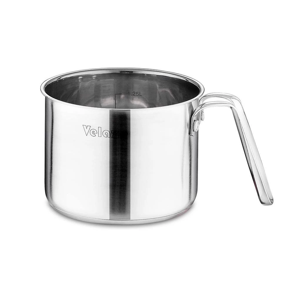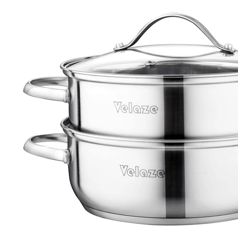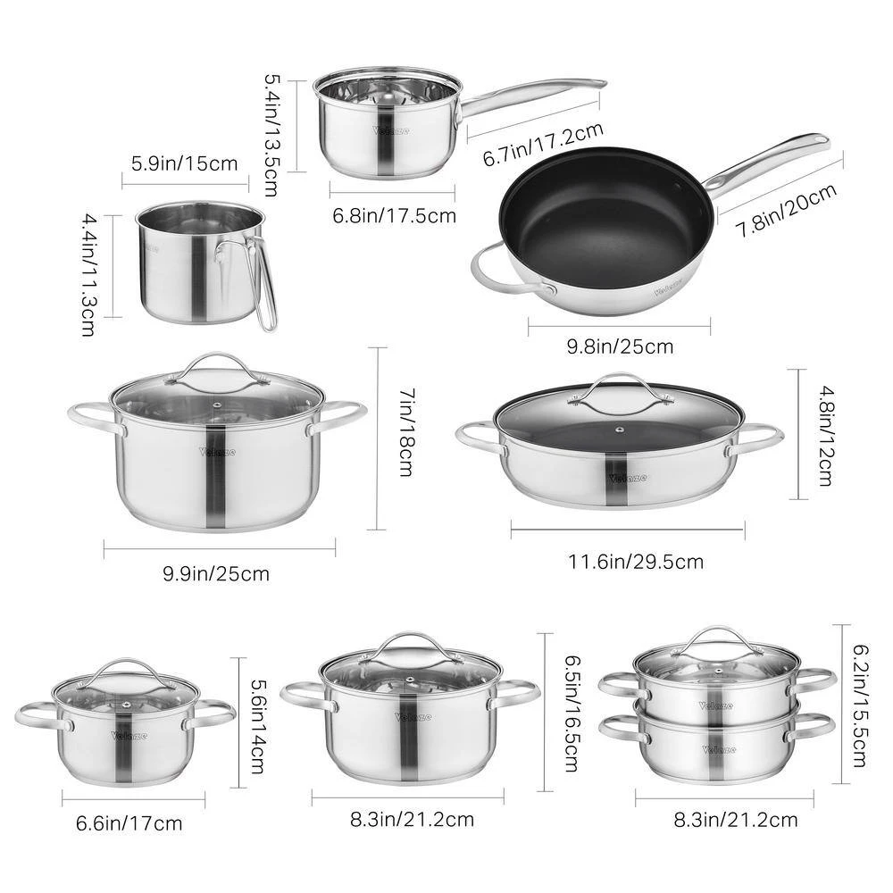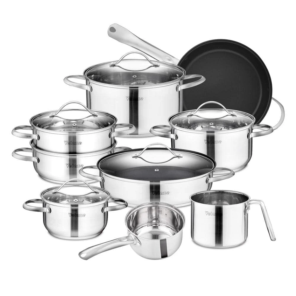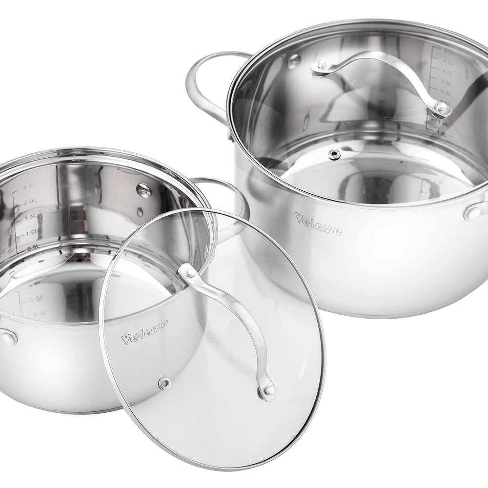 This cookware set from Velaze has all the essentials any kitchen needs. Featuring sleek, high-grade polished stainless steel bodies, these pot are sturdy and provide long-lasting durability. The generous handles offer a secure, comfortable, heat-resistant hold and come permanently secured with rivets. The cookware can be used on all stoves, including induction, and it’s oven-safe up to 500° F (260° C). It’s also dishwasher-safe for easy cleaning.