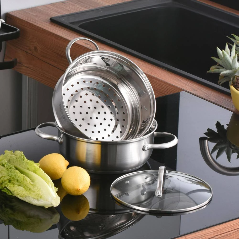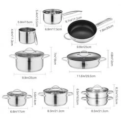 - Stainless-steel lids: secure-fitting lids trap heat for more efficient cooking, plus help seal in juices, nutrients, and flavor of food, and glass cover has a vent to release excess water