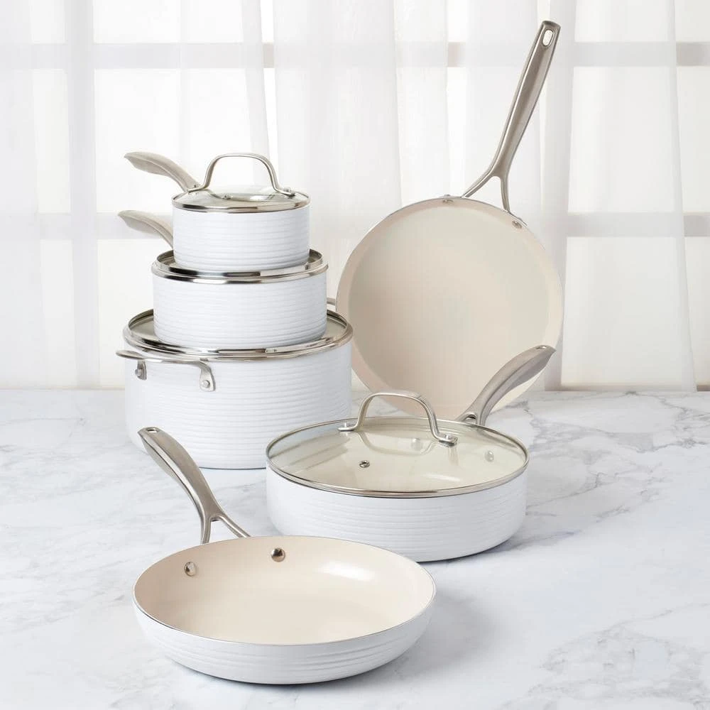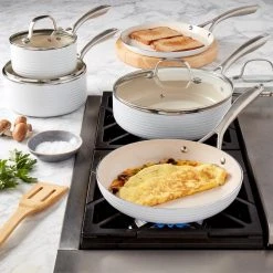 The 10-Piece non-stick aluminum cookware set from Denmark Tools for Cooks is beautifully designed and has been carefully crafted to uphold the stellar performance expected from high-quality cookware. This set couples superb non-stick coating with a durable aluminum construction that is ideal for daily use in high-traffic kitchens. The 10-Piece set includes everything necessary for a complete cookware collection. PFOA-Free non-stick coating provides incredible food release while easy to clean interior and exterior. Ergonomically designed handles provide a comfortable grip, tempered glass lids allow you to monitor the food without disturbing the cooking process.