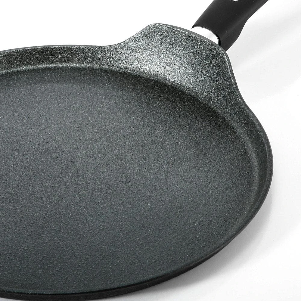 The CS KOCHSYSTEME Procalon Plus non-stick pans allow for cooking with less oil or fats. This forged aluminum nonstick cookware offers quick and even heat distribution with no hot spots, so you can enjoy cooking in less time. With a PFOA-free, three layer nonstick interior coating, food release and cleanup is made easy. MUNSTER aluminum cookware features a heat-resistant, black textured exterior, and a soft-touch handle that is comfortable and also heat-resistant. The low sides of a crepe pan also make great use for making and flipping naan bread, tortillas, pitas and even Dosa.