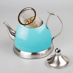 This stainless steel tea kettle is crafted of high quality heavy gauge stainless steel with 1.0 qt. Capacity. High quality stainless steel body with Aqua Sky Color finish. Includes a removable stainless steel tea infuser basket. Kettle heats up quick and retains heat well. Aluminum capsulated bottom provides even heat distribution. Can be used directly on any stove top or just pour your boiling water through the stainless steel infuser. Elegant and stylish design. Aqua Sky Color on body, brushed finish on lid and bottom rim.