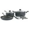 - Includes: 8 in. and 10.5 in. Frypans, 1 qt. and 3 qt. Covered saucepans, 5 qt. Dutch oven and 4 stainless steel measuring spoons