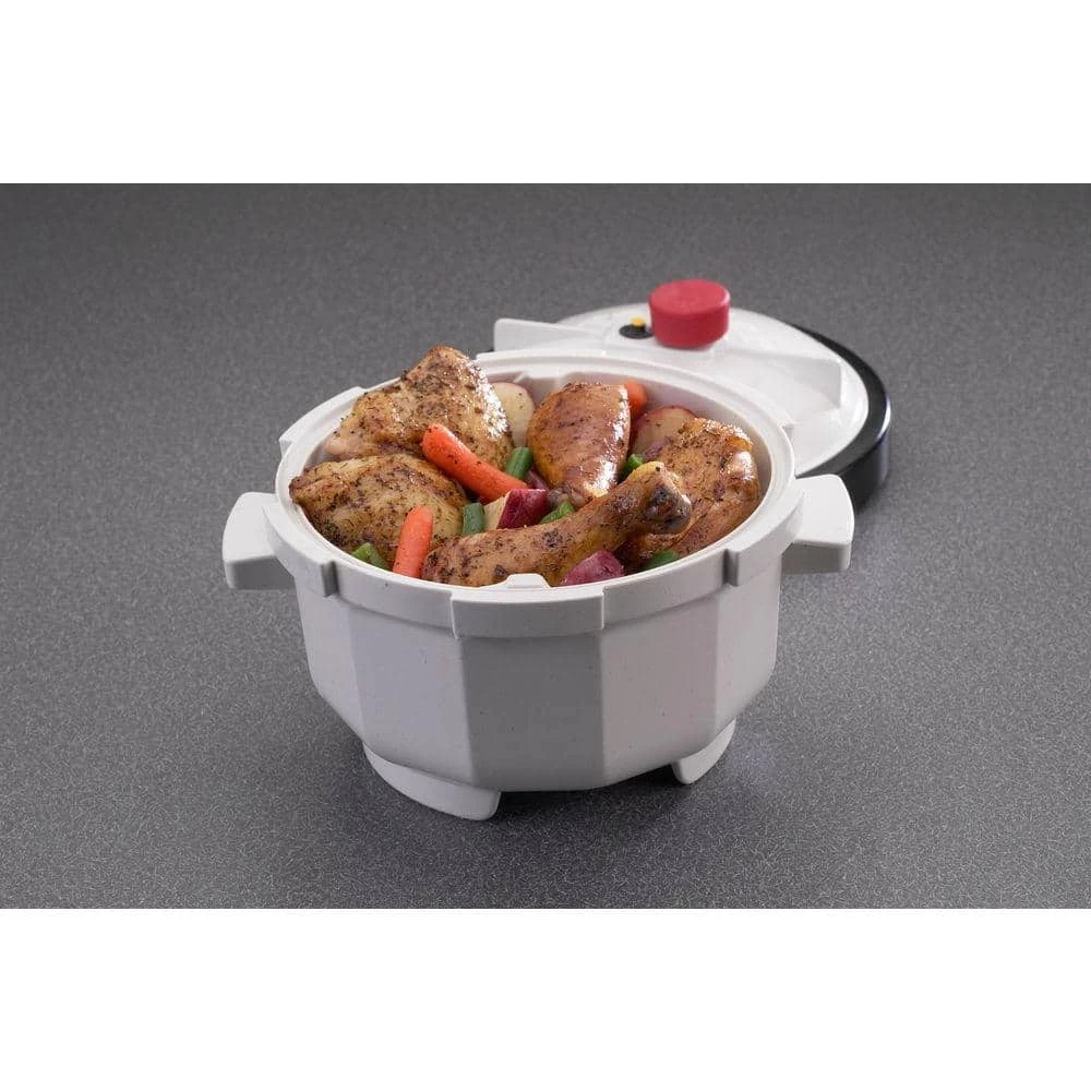 Microwave Tender Cooker works as a pressure cooker in the microwave. If you’re short on time, you can still prepare a delicious home-cooked meal for your family. Cooks and flavors meat, poultry or vegetables in 30 minutes or less. Requires 8.5 in. clearance in your microwave oven.