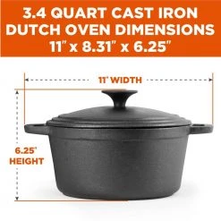 Serve delicious homemade meals to your friends and family with this Commercial Chef 3.4-quart cast iron Dutch oven. Includes a powerful dome lid and convenient loop side handles for ease of use and storage. Cook mouthwatering dishes indoors on your stovetop and oven or outside over a campfire with this well-insulated cast iron pot. Whether you’re creating an amazing soup or delectable casserole, this seasoned Dutch oven (13 in. H x 7.5 in. W) is highly versatile and reliable for years of quality use. Maintenance is simple as you handwash with gentle detergent and dry thoroughly with a towel. Cooking for your loved ones has never been easier.