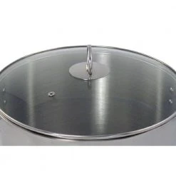 Cook up a steaming, hearty soup with this 20 Qt. stock pot. Features a tri-ply sandwich base for even heat distribution in 18/10 stainless steel, with a tempered glass lid for visibility to what is inside. The side-mounted handles stay cool to the touch and offer easy lifting with oven mitts, while the polished exterior adds elegance for stove-to-table serving and is dishwasher safe.