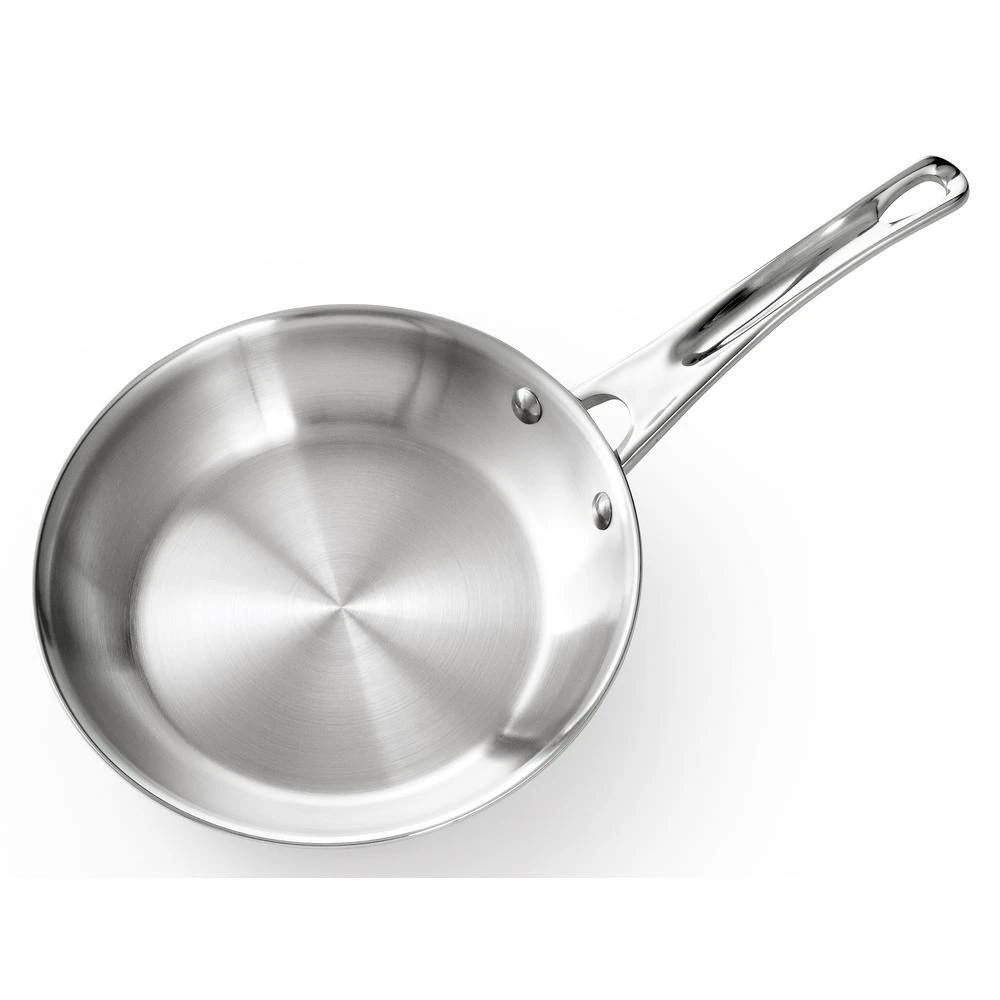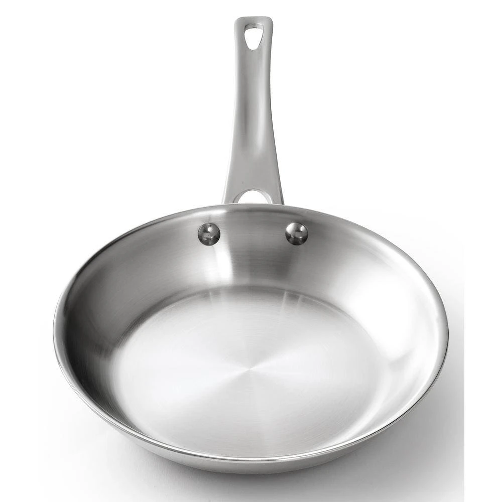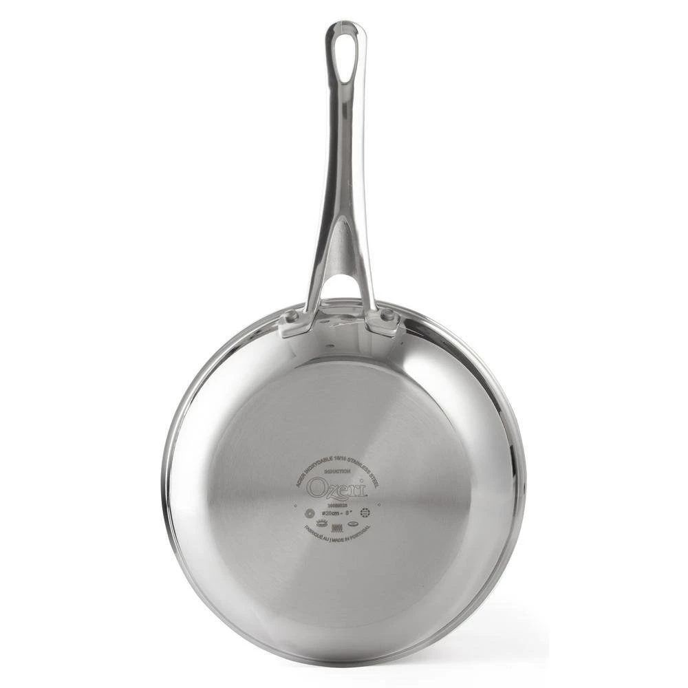 Made in Portugal with the finest craftsmanship and belonging to Ozeri’s coveted Professional Series Collection of cookware, the Professional Series Stainless Steel Earth Pan utilizes the finest 3-Ply material grades, with a resilient 18/10 (AISI 304) stainless-steel surface layer, a highly conductive aluminum (Grade 1050) core, and a magnetized stainless-steel AISI 439 outer alloy boasting titanium, for maximum corrosion and wear resistance. Certified to both EU and FDA 21-CFR 175.300 and FDA GRAS standards as food-safe, and manufactured by an ISO certified 9001, 14001, 50001 facility, the Ozeri Professional Series pan is made to withstand the most demanding cooking tasks and features a 100% PTFE and PFAS-free stainless-steel cooking surface that always maintains its color and luster, even when cooking foods that are highly alkaline or acidic. The Professional Series Stainless Steel Earth Pan is compatible with all cooktops (gas, electric, radiant, induction and ceramic stoves), allowing you to saute, fry, sear, brown, boil or braise without concern over altered flavors or uneven cooking. The pan walls are curved to exacting standards for easier tossing and flipping, with a beveled rim for cleaner pouring, and sport a polished mirror exterior that resists scratches and dents. Made to withstand the test of time, the Professional Series Stainless Steel Earth Pan by Ozeri is oven-safe and offers a professional-level cooking experience. Your satisfaction is guaranteed.
