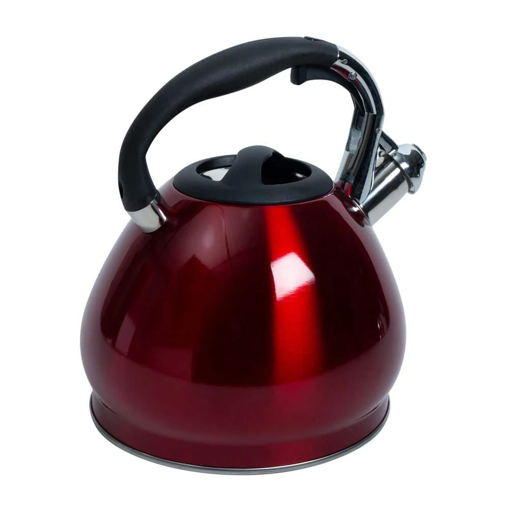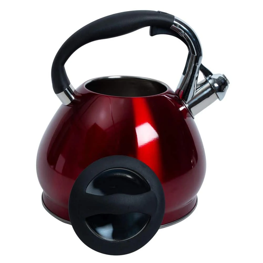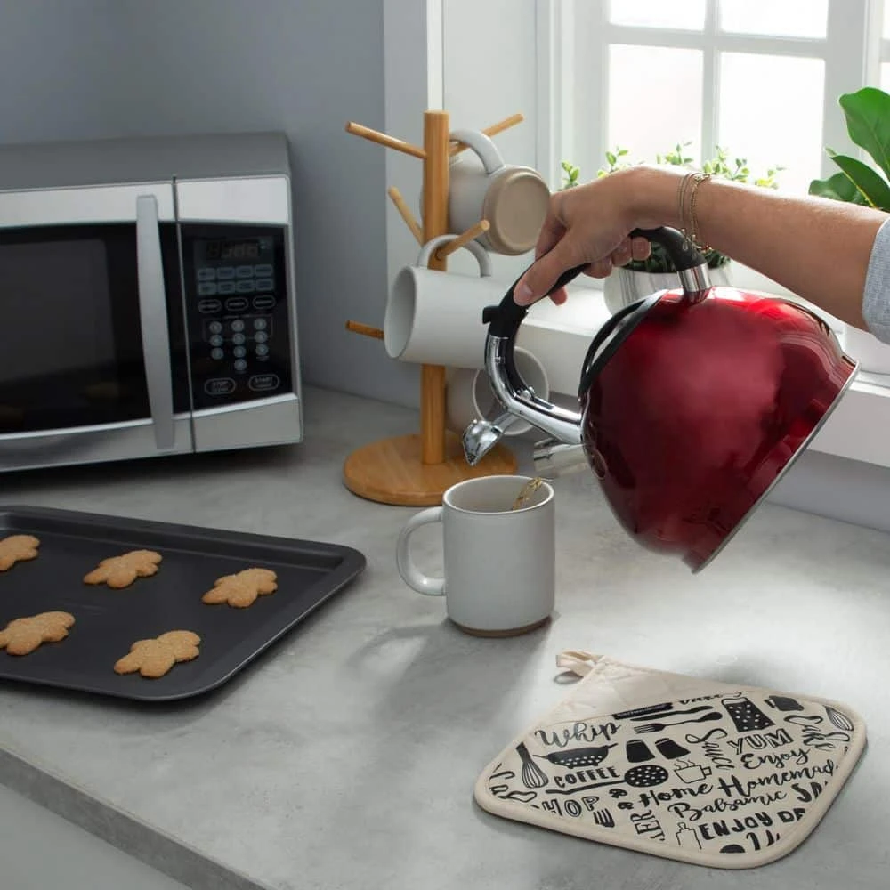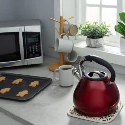 Boil water with this classic kitchen detail tea kettle. With its stainless steel design it sits on your stove top adding a sleek decor look to your kitchen. The whistle spout signals when water has boiled and the stay cool handle allows you safely pour the water. You can make up to 14 cups at a time when entertaining. Every kitchen needs this kitchen classic.