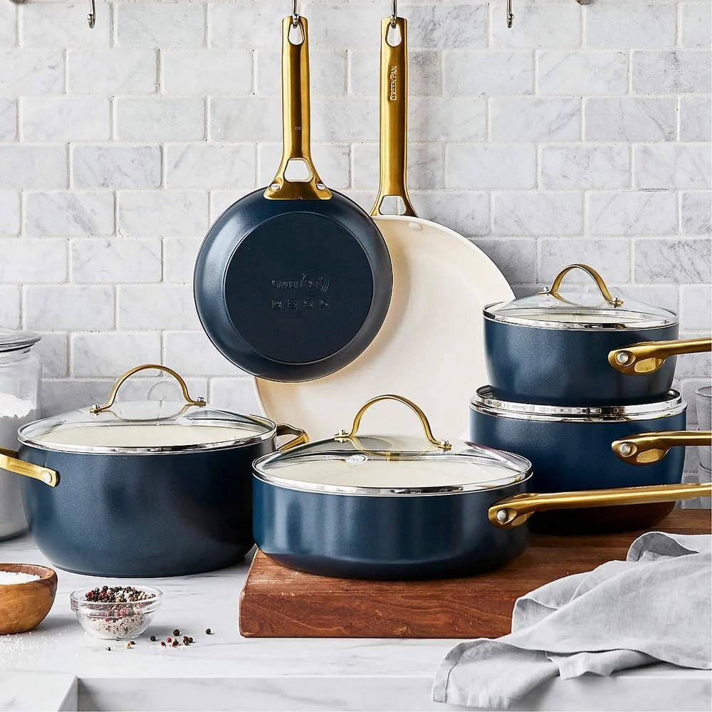 World-class performance meets minimalist chic in the GreenPan Reserve collection. These eye-catching pans are designed to stay beautiful- the collection’s duo forged hard anodized aluminum construction makes each of the pots and pans extra tough and scratch-resistant while also promoting even heat distribution for consistent cooking. Each pan features our Thermolon healthy ceramic nonstick coating, reinforced with diamonds to make it ultra-durable and heat responsive. Our ceramic nonstick coating helps you make any meal healthier because it’s free of PFAS, PFOA, lead, and cadmium and will never release toxic fumes, even when overheated. Durable glass lids give you an easy view of your meals and the matte stainless-steel handles make each pan easy to take from the stovetop to the oven. Dishwasher safe. Oven safe up to 600°F. This cookware set includes 8 in. and 11 in. Frypans, 2 qt. Saucepan with lid, 3 qt. Saucepan with lid, 3.3 qt. Saute pan with lid, and 5 qt. Stockpot with lid. Limited lifetime warranty.