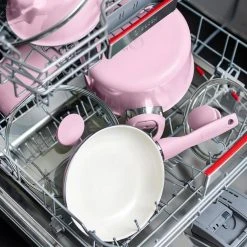 Add a touch of color to your kitchen with the vibrant style of the GreenPan Rio collection. This 16-piece cookware set features all the pots and pans you need to make your meals cleaner. Why? Each of these pots and pans features our Thermolon healthy ceramic nonstick coating-an easy release and wipe clean coating that’s free of PFAS, PFOA, lead, and cadmium for worry-free cooking. Unlike many other nonstick coatings, it will never release toxic fumes, even if it’s overheated. This durable coating is reinforced with diamonds to provide peak nonstick performance longer. The set’s heavy-duty construction gives you even heat distribution while the stay-cool Bakelite handles give you a comfortable grip and total control. Durable glass lids give you an easy view of your meal in progress without sacrificing heat. Dishwasher safe. These pans and lids are oven safe to 350°F. This cookware set includes: 5″, 8″, and 10″ frypans; 1.2QT and 2.2QT saucepans with lids; 2.8QT saute pan with lid; 5QT casserole with lid; stainless steel steamer; and 4 bamboo tools. Limited lifetime warranty.