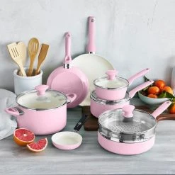 - Cookware Set Includes: 5″, 8″, and 10″ frypans; 1.2QT and 2.2QT saucepans with lids; 2.8QT saute pan with lid; 5QT casserole with lid; stainless steel steamer; and 4 bamboo tools