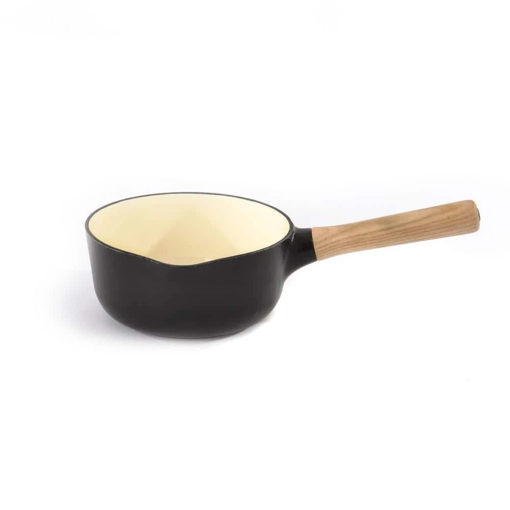 Enjoy heating up your sauces in this stylish, black, heavy-duty cast iron sauce pan from the Ron Collection. Featuring a 1.8 Qt. capacity, and a wooden handle for a safe, cool, comfortable grip, this pan will handle all of your warming needs and keep coming back for more. Cast iron, enameled body provides unprecedented heat retention, keeping your sauces warm even when not on the stove. Hand wash with water.