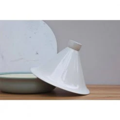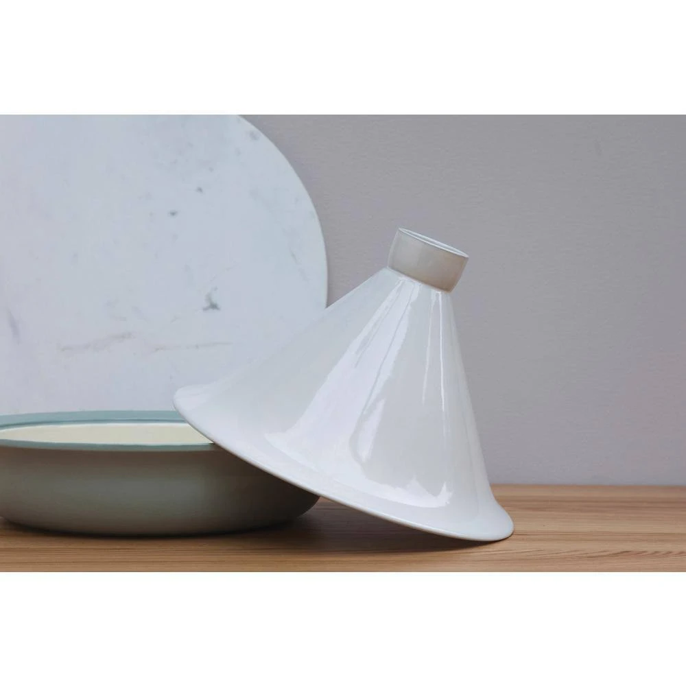 11 in. /3.5qt Green Covered Deep Skillet is made of Cast iron which has great heat retaining abilities: it’s the perfect choice for slow cooking and for hearty stews prepared in the oven or on the stovetop. The cover locks in the moisture and small bumps on the interior make sure the evaporated juices are directed on to the food for extra tasty results. Only little oil is needed with this pan: the perfect option for low-fat frying. Wide handles for a safe grip, even when wearing oven mitts or using potholders. 11.5 in. White Tajine cover to fit the 11 in. cast iron deep skillet from our Ron collection. Turn the deep skillet into a tajine, perfect for real slow cooking and all traditional dishes. Traditional cone shaped lid, allowing the steam to re-condense into water droplets which fall back onto the ingredients for tender, moist results. Elegant design for stove top and oven to table use. Oven safe.