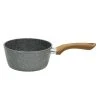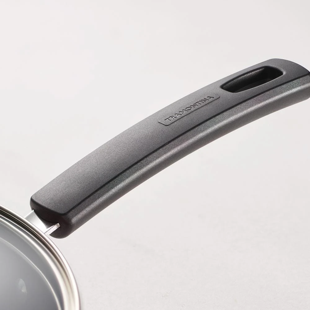 Tramontina Sicilia 2.5 qt. Aluminum Nonstick Covered Sauce Pan has room to reheat soups and prepare flavorful sauces for your meals. The even gauge construction and heavy-gauge aluminum exterior mean you’ll have this pan in your kitchen for years to come. The Starflon Excellent nonstick interior finish is Tramontina proprietary nonstick system, which makes clean up less stressful. The matching heat and shatter resistant tempered glass lid has a vent hole and stainless steel rim, allowing you to watch the process of your meal while it’s simmering. The long handles are Sicilia style stamped shank with over molded Bakelite, which means this sauce pan is not for oven use. This cookware is made in Brazil and available in several colors.