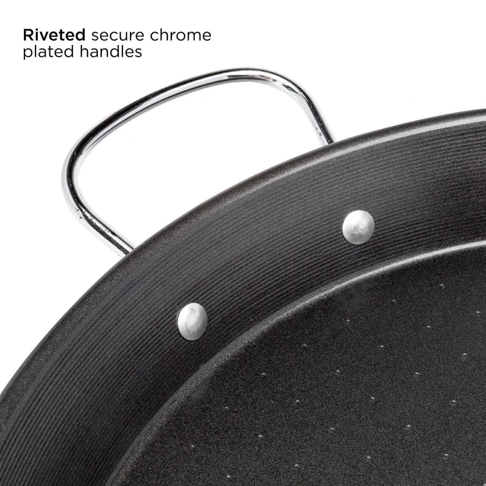 This beautifully designed pan features the classic wide and shallow shape recommended for paella. Made of heavy-duty gauge carbon steel, it heats quickly and evenly. Its PFOA-free non-stick coating adds to its convenience. The riveted steel handles offer a firm and stable grip for carrying from stovetop to table for serving. The pan is dishwasher safe for quick clean up. The Ecolution SOL 16 in. Carbon Steel Paella Pan works on any stovetop, including induction. After your purchase please consider how to recycle your old cookware. You can visit Ecolutionhome.com to get a listing of local charities to donate your cookware or ways to renew/ recycle your old pans, you know “the other stuff in your cabinet”. Ecolution believes that cooking well in the kitchen and doing good for the planet can happen at the same time. From our family of chefs to yours we say Cook Well. Do Good.