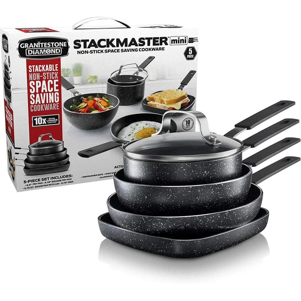 Revolutionize the way you cook and the way your kitchen cabinets look with Granite Stone Stackable Space Saving cookware. Constructed with a triple coated natural mineral surface, this Granite Stone Stackable is the perfect balance for ultra-nonstick and long-lasting durability. They can withstand metal utensils and are dishwasher safe for easy clean up. Granite Stone Stackable cookware has a unique design that saves 30% more cabinet space; it allows the pans, pots, and glass lids to nest together as a secure stack. This cookware set features popular pots and pans needed for everyday cooking.