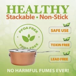 Revolutionize the way you cook and the way your kitchen cabinets look with Gotham Steel Stackable Space Saving cookware. Constructed with a triple coated cast-texture coating, this Gotham Steel Stackable is the perfect balance for ultra-nonstick and long-lasting durability. They can withstand metal utensils and are dishwasher safe for easy clean up. Gotham Steel Stackable cookware has a unique design that saves 30% more cabinet space; it allows the aluminum pans, pots and glass lids to nest together as a secure stack. This cookware set features popular pots and pans needed for everyday cooking, baking, and even roasting.