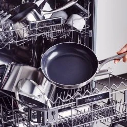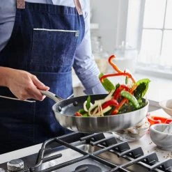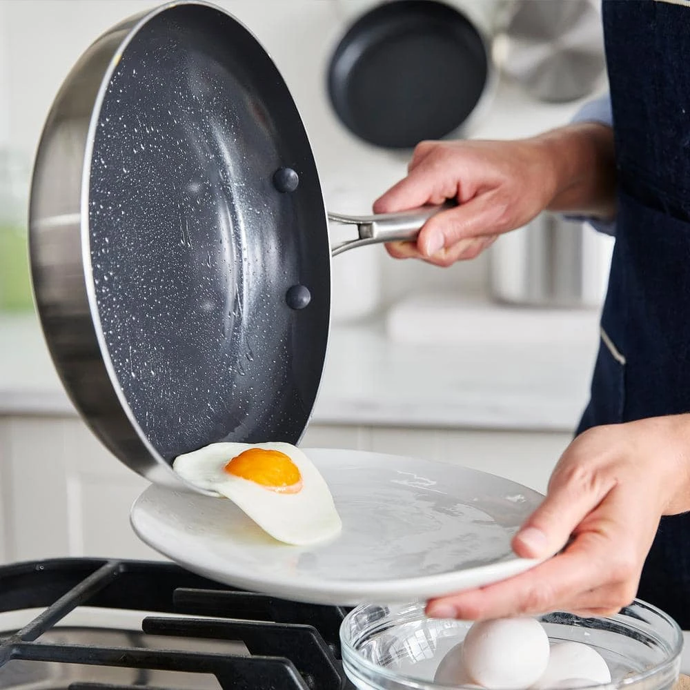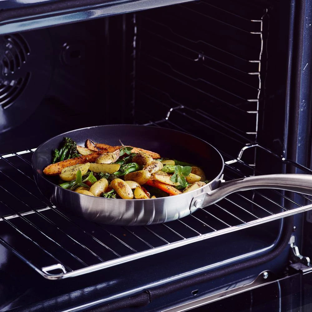 Shine on the stovetop with this tri-ply stainless steel frypan set from Blue Diamond. This pan is crafted with two stainless steel layers surrounding an aluminum core that extends up each side to deliver responsive performance with unbelievable power. Blue Diamond’s unique signature coating works with the 3-ply bodies to promote fast and even heating, incredible durability, and dazzling results on all stovetops, including induction. The stay-cool handles keep these pans comfortable on the stovetop while their unique angled design makes these pans stackable for easy storage.