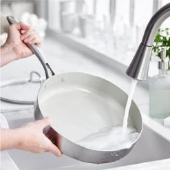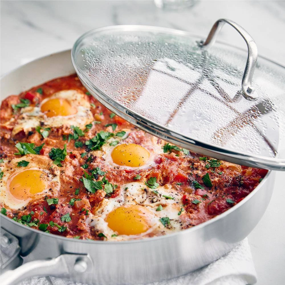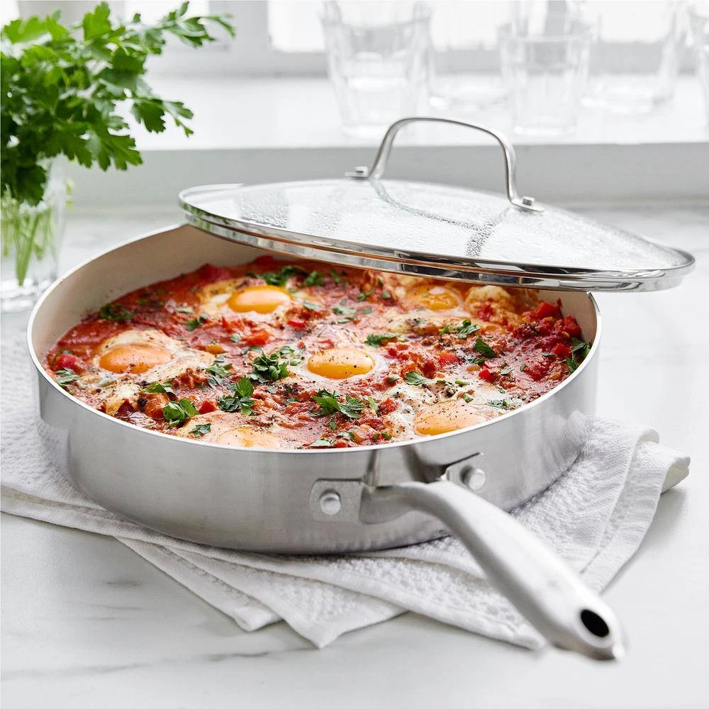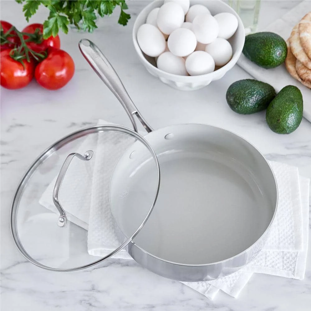 Your go-to pan just got a makeover-this 3-ply saute pan take on any kitchen task with room to spare. Featuring 2 layers of stainless steel surround an aluminum core, this collection heats quickly, evenly and performs as good as it looks. And it’s finished with our toxin-free ceramic nonstick coating, so everything you make will be a little healthier, too. That’s because our ceramic nonstick is not stuck in the past-our ceramic nonstick starts with sand and creates 60% fewer CO2 emissions during the curing phase than traditional coatings.