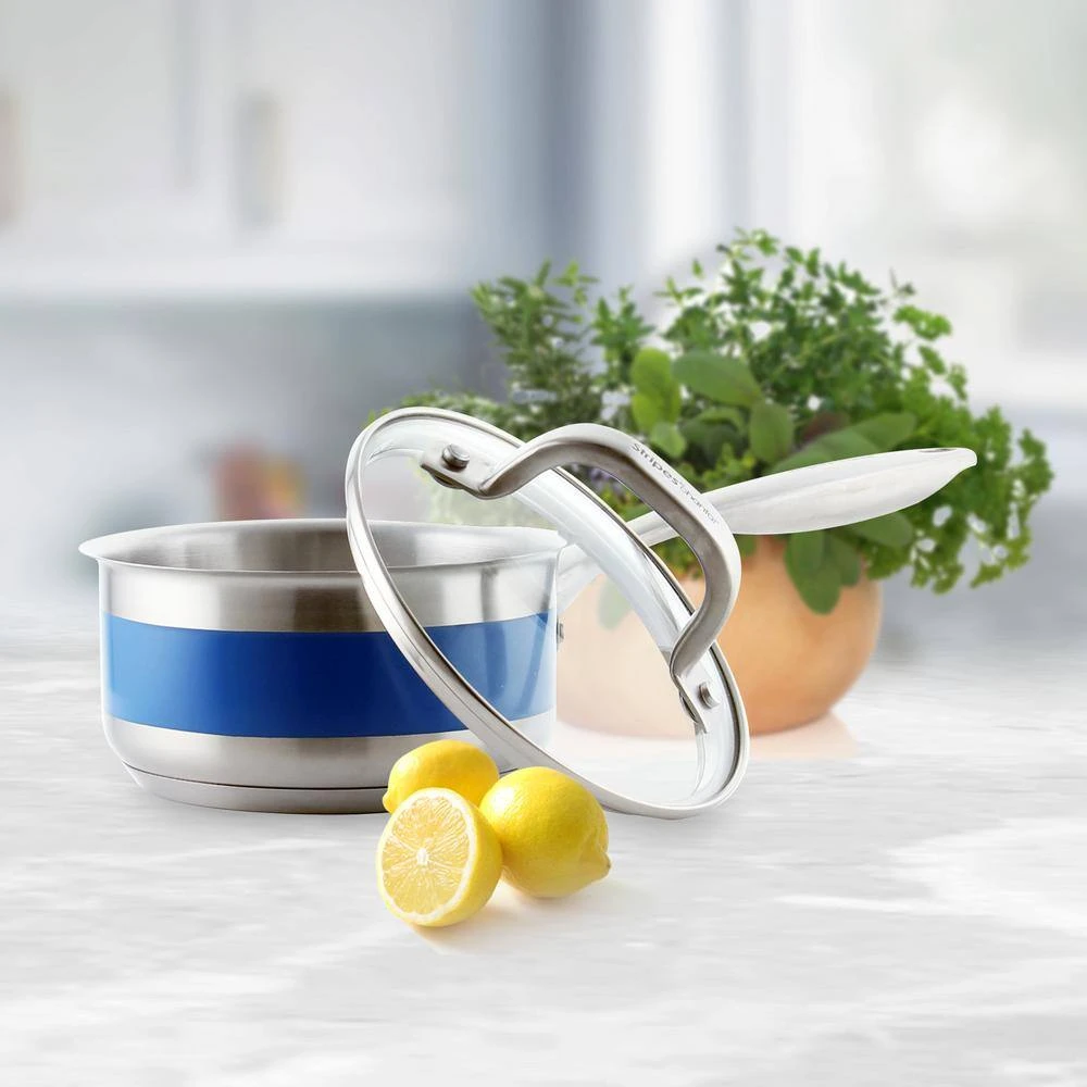 Add a “Stripe” of color to your kitchen. The Stripes cookware line from Chantal is made with heavy-duty commercial grade stainless steel with a subtle, yet distinct, strip of color on the exterior. Perfect for the young aspiring chef who needs top quality cookware or for a more experienced chef who just wants a pop of color on their stove. Bring some fun into the kitchen with this vibrant line. The 1 qt. Sauce Pan is perfect for individual soups, sides, and sauces.