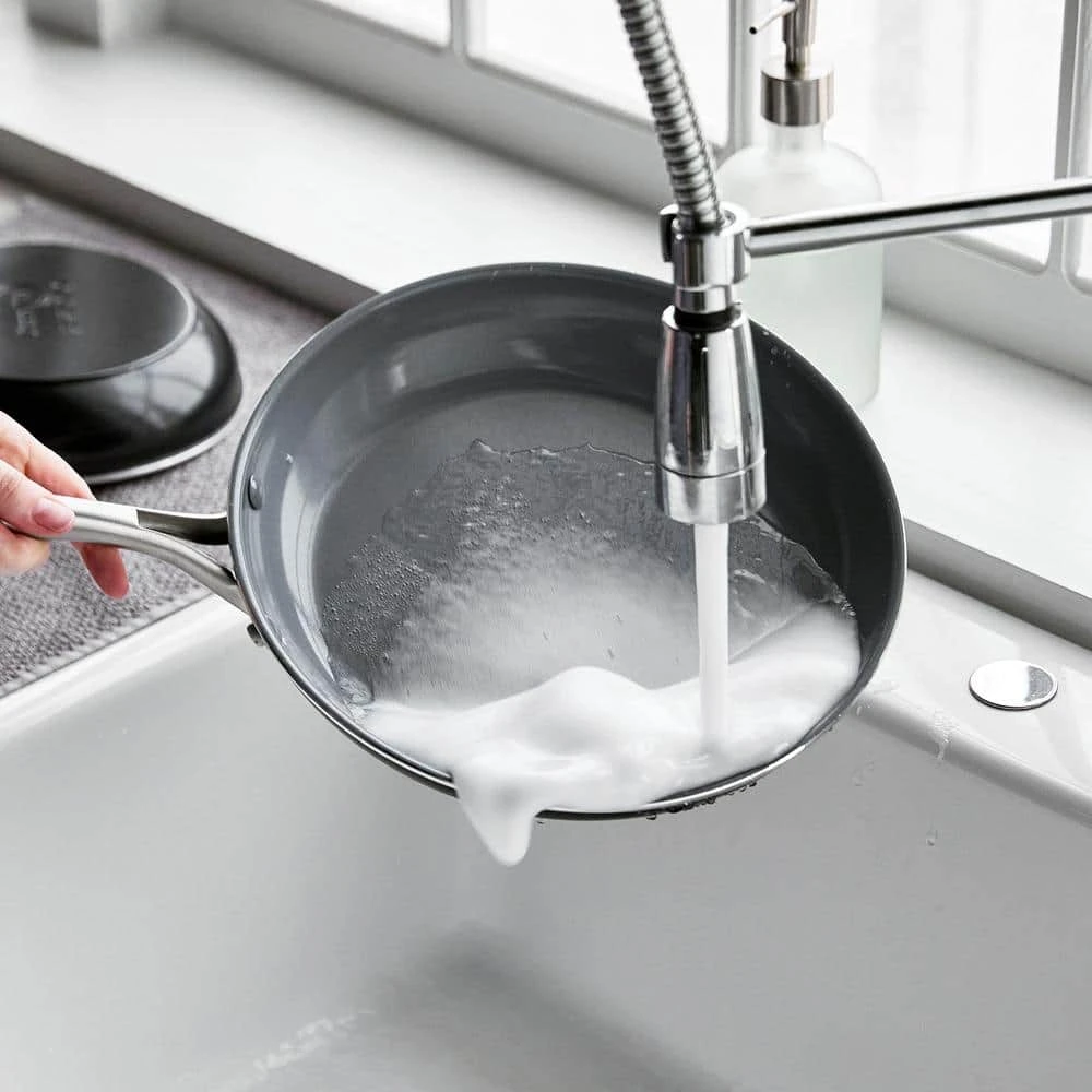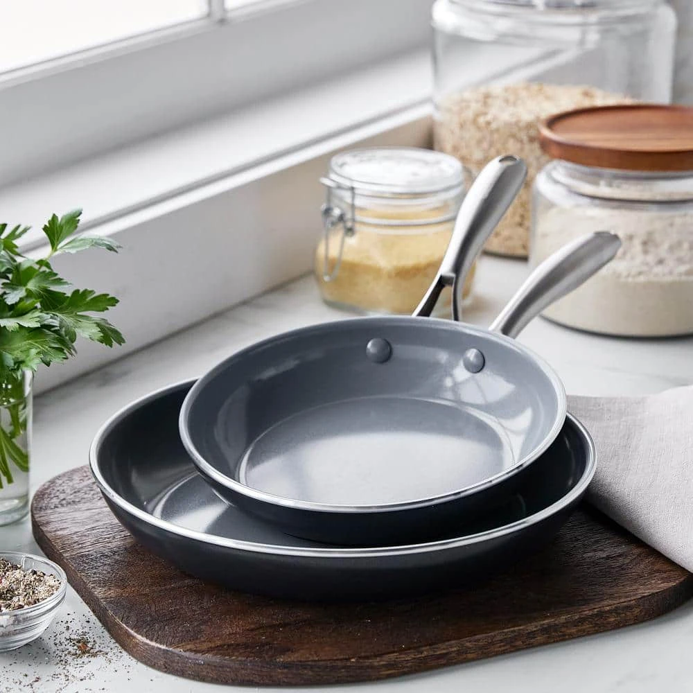Get to your meal faster with GreenPan Swift. Crafted from quick-heating aluminum, this collection delivers outstanding heat transfer and stunning performance. Plus, thanks to our healthy ceramic nonstick coating, you won’t have to spend time.scraping and scrubbing. Whether you’re making morning eggs, crispy fish, or mouthwatering steaks-everything’s easy to plate with the drip-free pouring rims. The sturdy stainless-steel handles give you total control.
