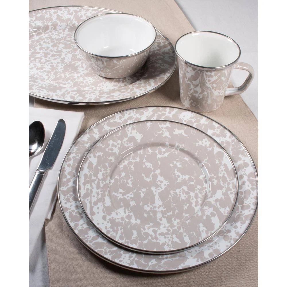 3 qt Saute Pan, 9.5 inch diameter, 2.5 inch deep. This enamelware is made of carbon steel coated with a porcelain enamel and trimmed in stainless steel. There will be variations in the shading of colors and pattern formations which are the results of the hand-dipped process. The swirl design is a classic, retro staple for enamelware cookware and serveware. The contrast of colors creates a distinct look and brings a casual artistic flair to your table setting. Each piece is individually hand crafted and is as unique as you are. Skilled artisans hand dip the white background color, then use a brush to hand apply the secondary color swirls. This creates a unique piece and design each time. The elegant and inviting aesthetic draws the eyes into the many spattered patterns flowing throughout. Your piece will be one-of-a-kind and exclusive to you as you create your own distinctive style.