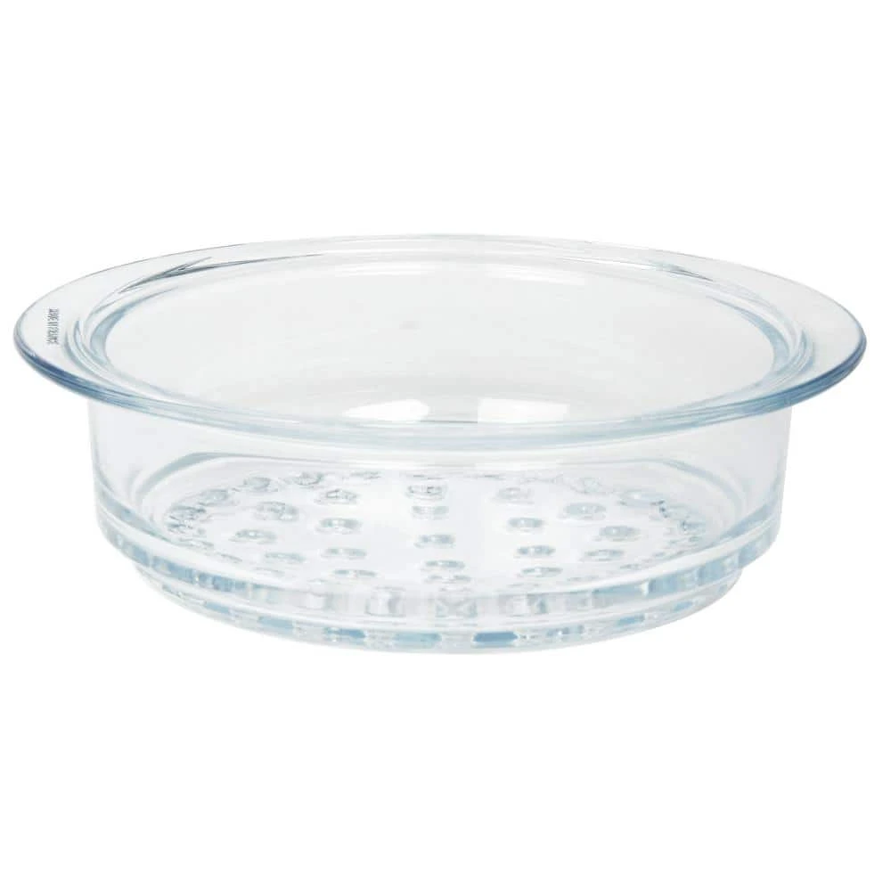 The 9.5 in. glass steamer without lid fits the 3.5 Qt. saut pan and is included in the 9-Piece starter set. It uses the lid that comes with the 3.5 Qt. saut pan. It offers advantages over conventional steamers as you can monitor cooking performance from the sides and the top. Made from durable borosilicate glass in France.