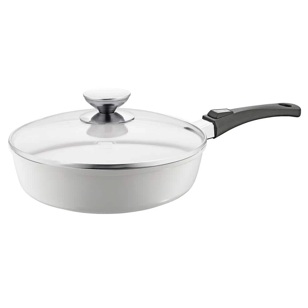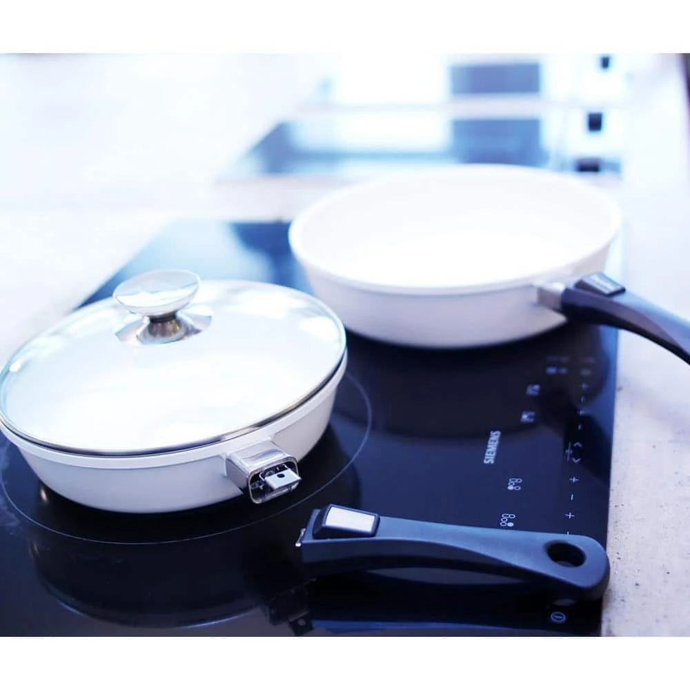 - 4 Qt. saute pan featuring high-quality Berndes ceramic pearl coating and tempered glass lid; induction compatible; handle removes for oven use